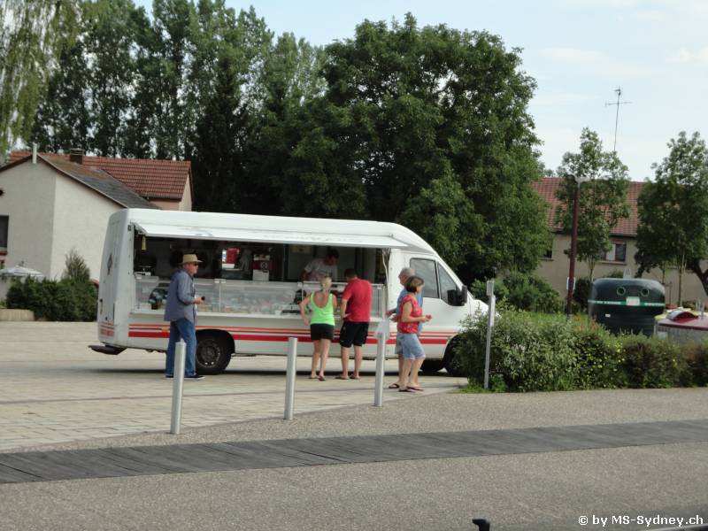 Auf einmal störte ein Gehupe die sommerliche Ruhe. Gross war unser Staunen, als wir sahen, was da den Lärm verursacht hatte. Es war ein Metzger, welcher mit seinem Liefer- resp. Verkaufswagen die Leute auf sich aufmerksam machte. Am nächsten Morgen dieselbe Geschichte mit dem Bäcker. Beide Angebote sind bei den Böötlern und den Campern, welche in der Zwischenzeit auch wissen wo es schön ist 😉 sehr gut angekommen und es wurde rege eingekauft.