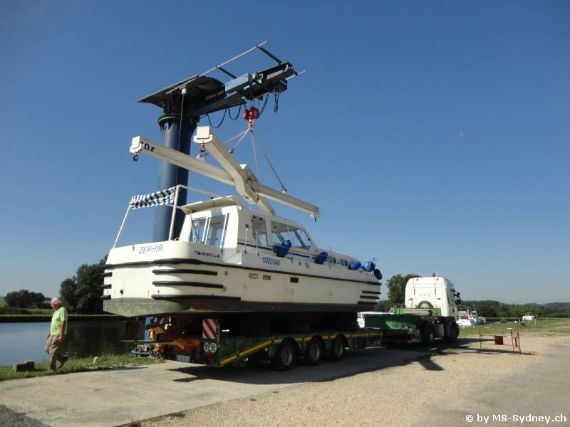 Heute Morgen um ca. 9.30 Uhr kam dann auch der LKW samt Begleitfahrzeug mit dem ersten der 7 Schiffe, welche überführt werden sollten. Nach dem dritten Boot sollten wir dann als Retourfuhre auf der Strasse das blockierte Hebewerk umfahren. Aber diese Lösung war wohl zu einfach und somit nichts für uns. Beim Abladen des ersten Schiffes hat ein Mitarbeiter der Firma „le boat“ derart auf Französisch geflucht, dass sogar ich mit meinen wenigen Französischkenntnissen rot geworden bin. Es hat ihm scheinbar niemand gesagt, dass heute etwas Arbeit auf ihn zukommt. Dieses Getue hat den Kunden derart verärgert, dass er die übrigen Boote in seinem eigenen Hafen in Lagarde abgeladen hat und die „le boat“ und uns einfach „hocken “ lassen hat. DANKE Jungs !