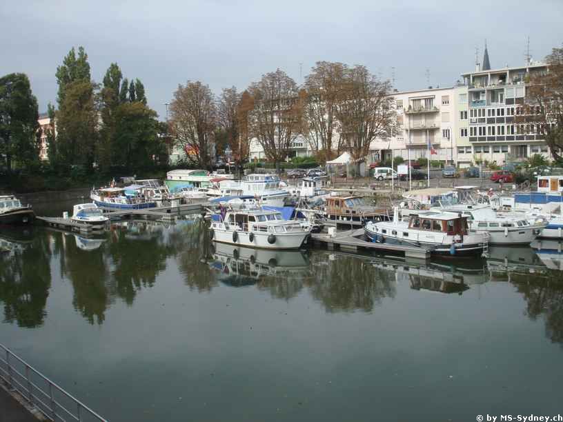 Nach nur kurzer Fahrt auf dem Kanal mussten wir uns den warmen Jacken entledigen, weil uns die Sonne einen wirklich tollen Herbsttag bescherte. Bei schönstem Wetter schipperten wir bereits das zweite Mal in diesem Jahr nach Mulhouse. Kurz nach dem Hafen Ile Napoleon wird der Kanal enger und ist somit nur noch mit Freizeitbooten befahrbar. Für die Frachter ist hier kein Durchkommen mehr. Dies nicht zuletzt auch wegen der nachfolgenden niedrigen Brücken und der doch eher kleinen Schleuse am Stadtrand von Mulhouse. Nach rund vier Stunden sind wir im Port de Plaisance in Mulhouse eingetroffen. Hier haben wir gemerkt, dass eigentlich die Saison bald vorbei ist, zumal die Hälfte der Hafenplätze frei waren.