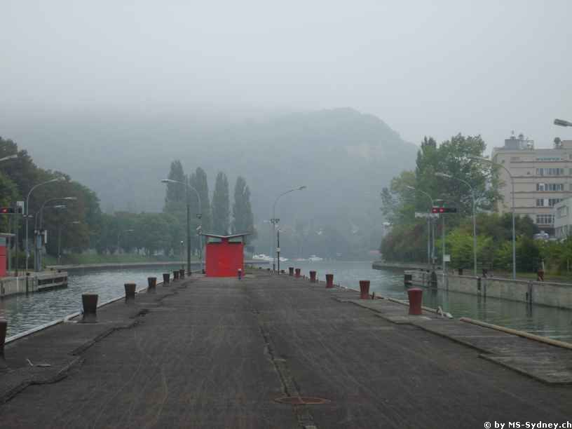 Wir sind früh zu Hause losgefahren, damit wir zeitig in Birsfelden schleusen konnten. Umgehend nach unserer Anmeldung bei der Schleuse Birsfelden konnten wir diese passieren und sind diesmal bei Frühnebel durch Basel gefahren. Wie immer ein tolles Erlebnis. Vor der Schleuse Kembs mussten wir gut eine Stunde warten, da der Schleusenwärter scheinbar auf einen weiteren „Gast“ warten wollte. Die Wartezeit verkürzten wir mit einem feinen Kaffee, welchen wir mit Hilfe unseres Generators zubereitet haben. Wir sind immer wieder erstaunt, wie gut eigentlich unsere Sydney eingerichtet ist. Wir haben alles dabei, was wir zum Wohlsein brauchen.