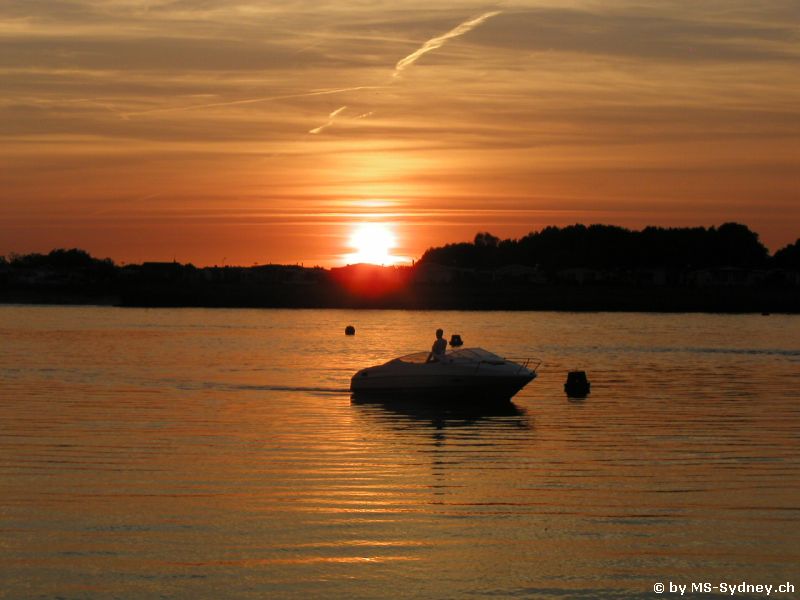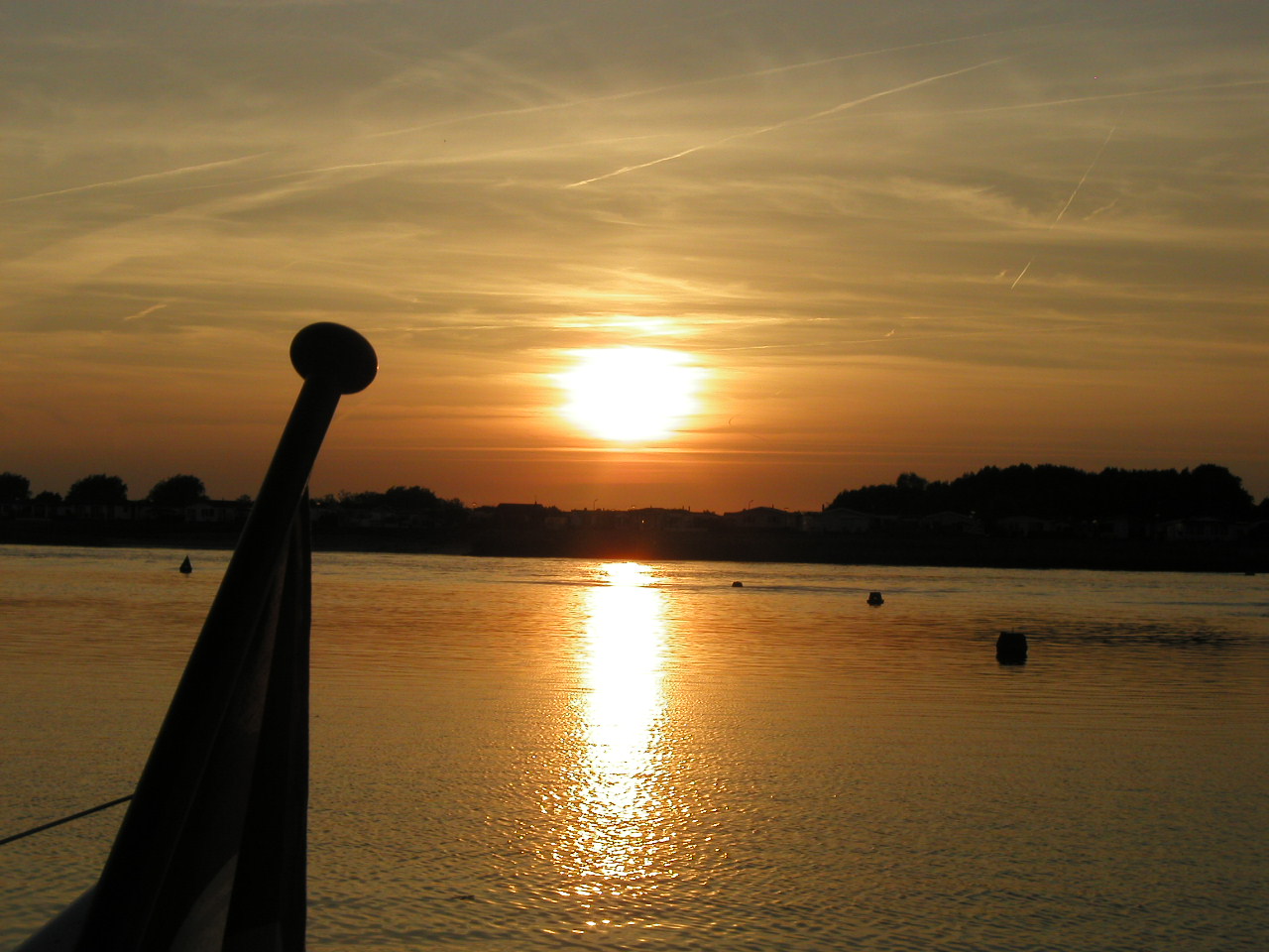 Wir geniessen einen richtigen Sommertag und freuen uns über jeden Frachter, welcher vorbei fährt. Und dies sind doch einige. Es kommt uns vor, wie wir am Rhein wären. Oder ist das sogar der Rhein? Natürlich kann Astrid auf ein wirklich gelungenes Sonnenuntergangsfoto nicht verzichten.