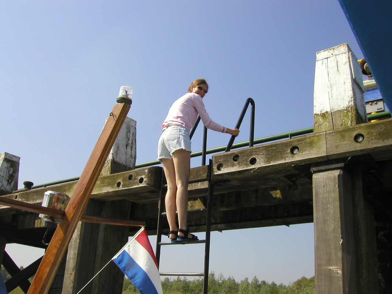 Wir entschliessen uns, ansatt die Fahrt durch die Zuid-Willemsvaart fortzusetzen (Max. Geschwindigkeit 5 km/h) uns auf der Maas in Richtung Belgien, resp. Frankreich zu bewegen. Die Maas präsentiert sich heute Sonntag als ausserordentlicher Wassersportplatz für die Einheimischen. Wir begegnen den ganzen Tag immer wieder Wassertöffs, Wasserskifahrer, Wakeboarder, Seglern und sonstigen Wasserbegeisterten. Ein echt toller Tag geht nun dem Ende entgegen. Auch passieren wir wieder Schleusen, welche als Schleusen bezeichnet werden können. Astrid erklimmt jedes Hindernis, um uns beim Schleusenwärter anzumelden.